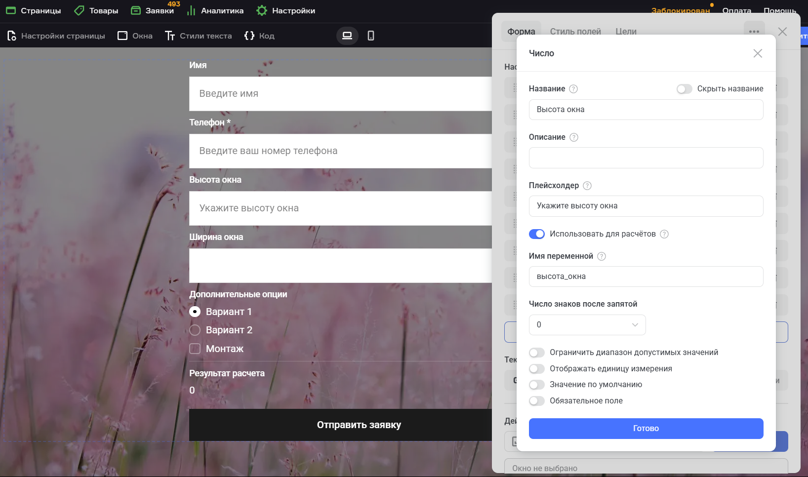Поле Результат расчетов поддерживает математические операции и самовыполняемый JS;