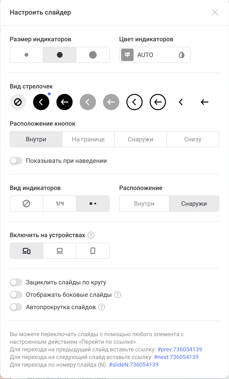 Настройки слайдера элемента